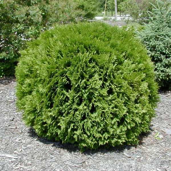 Крона шаровидная, позднее становится более широкой, вырастает в высоту до 1,5 метров в 10 лет. Одна из немногих туй, которая обладает округлояйцевидной формой кроны и достаточным ростом, чтобы выступать в качестве солирующего растения в композициях. Побеги густые, прямые , плоские. Хвоя от темно-зеленой до светло-зеленой. Плоды – маленькие коричневые шишки.<br>